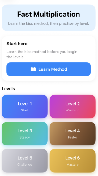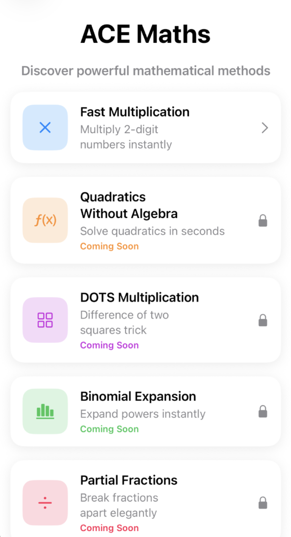 ACE Maths is a new iPhone and iPad app that teaches powerful mental maths techniques through clear visual explanations and fast, addictive gameplay. Built initially around intuitive methods for multiplication, percentages, and squaring, ACE Maths helps learners develop speed, confidence, and genuine understanding — not rote memorisation. Designed for ages 10+, students, and adults alike, ACE Maths turns mathematical “tricks” into lasting skills.