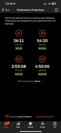 Over the last week I have done a 5km run, a 9km in between a 600 exercise session (which was a very tough day) and some 1km sprints. My predicted times have started to come down a bit on Strava which is very motivating.