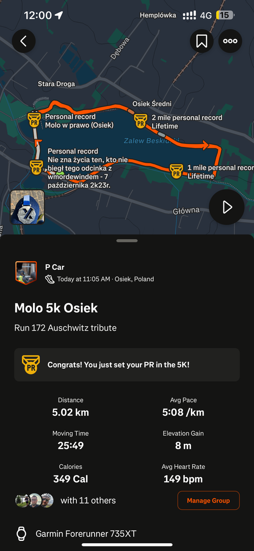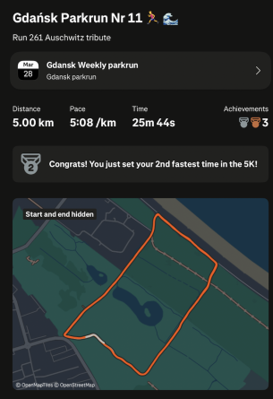 This weekend I entered a charity 5km race in my wife's home village. I ran it last year as well, getting a time of 33 mins. This year I was hoping after my record in the half at Gdańsk a week earlier I could break my 5km record, even though I'd shown zero sign of it in training. Lovely weather and event around a hotel lake. Around 300 runners, which made for a bit of chaos at the start as I was right at the back and had forgotten that this wasn't an ideal place to start on a narrow path and spent the first 500m overtaking people (although, this was a bit of a pleasant surprise, that I was able to at all). This burnt up some energy too, and it started to hurt from there onwards! However I knew I had to keep at a 5:00/km pace at the least and then if I tired I could still get around 25:30, which I'd be happy with.
