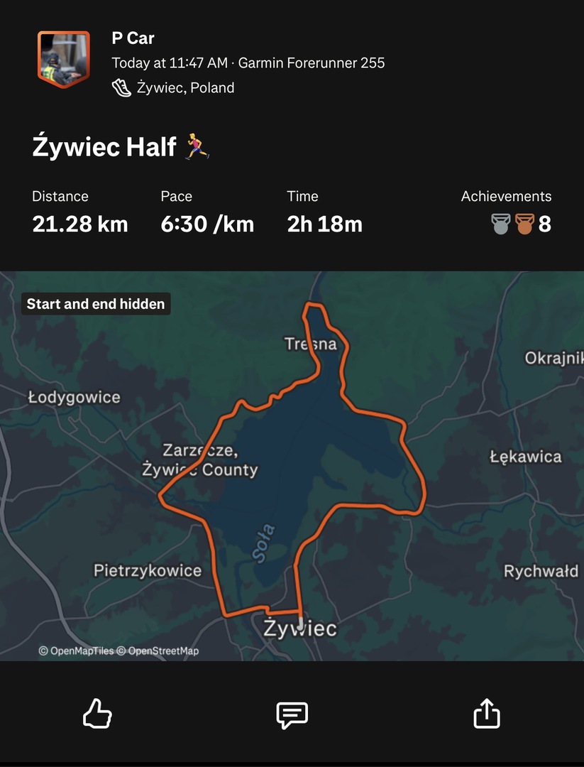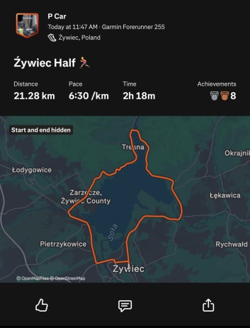 Next race entered: Zywiec half-marathon. Run twice before, times 2:28 and 2:08. Hoping for 1:55 territory.