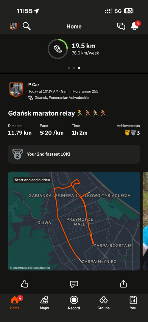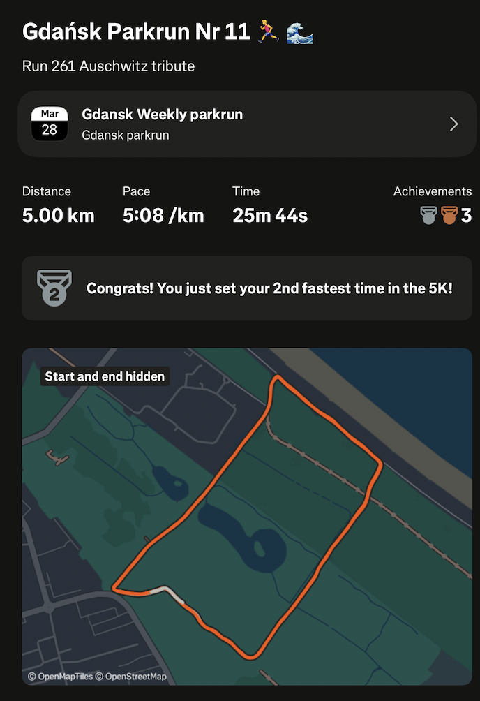 I've just about got better from this virus and although this reduced my training time quite considerably, I was able today to run in the Gdańsk marathon relay, running about 12km as part of a team. An excellent event where I found myself running from a soft-play place we took the kids in 2023 (never thought I'd be back to run here!) and around to the back of 'Tysiaclecia'. I was third in the team and it did feel like the whole route was uphill(!), but I pushed hard for the sake of our time and when I got to the end I had definitely 'emptied the tank'. My time was just 12 seconds slower than my best ever 10k time (since I began running again). So about 1 sec per kilometre.